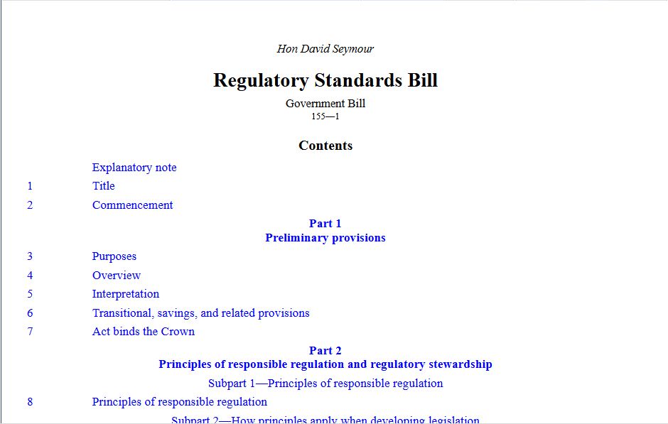 2011: Another Bill of Parliament introduced by A.C.T., as the Regulatory Standards Bill, by then Minister for Regulatory Reform, Rodney Hide. Attempting to build on the prior Bill, it failed to pass the First Reading